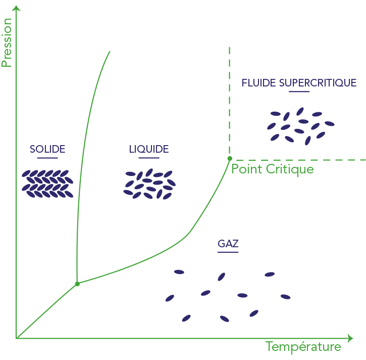 A l'état supercritique, plus de 74 bar et de 31°C, le CO2 possède des propriétés très particulières. Le fluide obtenu est caractérisé par une grande diffusivité, de l'ordre de celles des gaz, et une densité élevée qui le dote d'une capacité de transport et d'extraction importante.